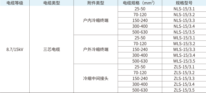 1.“WLS-15/3.1”表示三芯户外冷缩终端,额定电压为15kV适用于电缆截面为25-50mm2的三芯电缆。