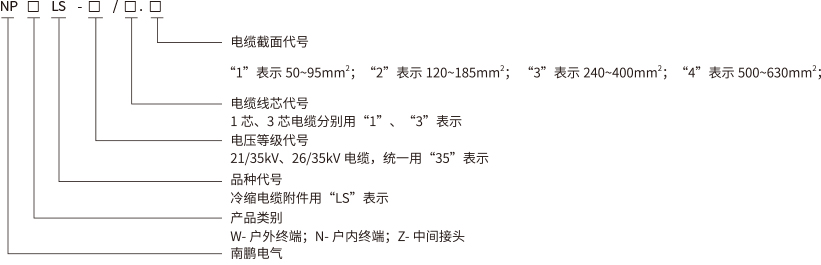 1.“WLS-35/1.1”表示单芯户外冷缩终端,额定电压为35kV适用于电缆截面为50-95mm2的单芯电缆。