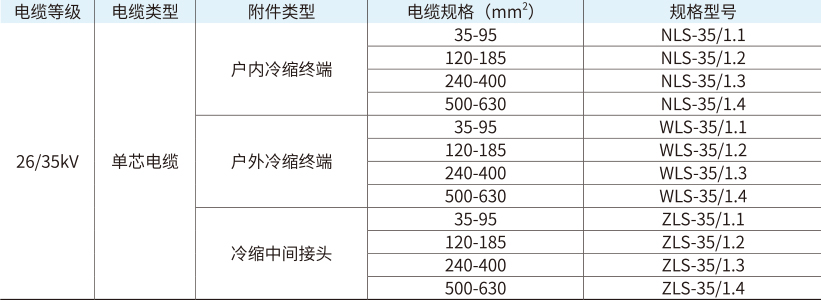 2.“ZLS-35/1.3”表示单芯冷缩中间接头,额定电压为35kV适用于电缆截面为240-400mm2的单芯电缆。