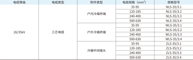 2.“ZLS-35/3.3”表示冷缩三芯中间接头,额定电压为35kV适用于电缆截面为240-400mm2的三芯电缆。