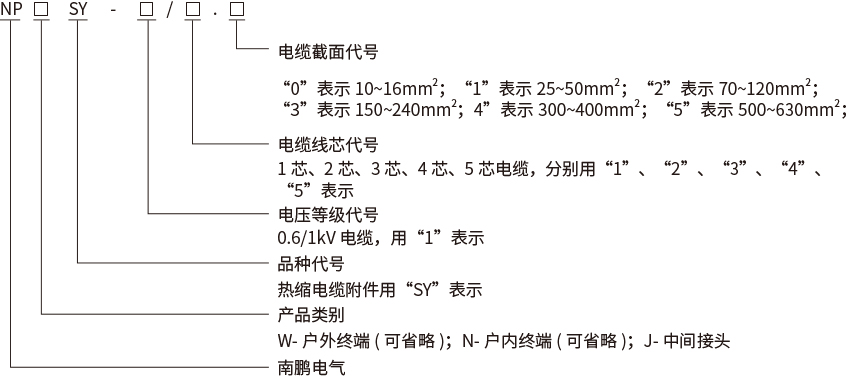 例:1.“JSY-1/4.1”表示四芯热缩中间接头,额定电压为1kV适用于电缆截面为25-50mm2的四芯电缆。