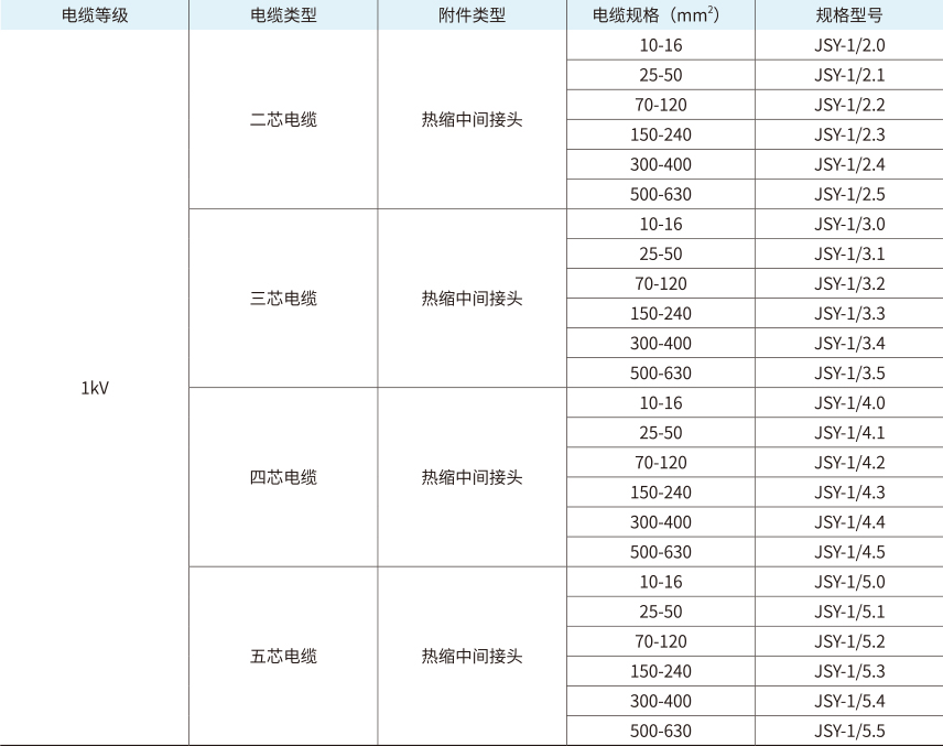2.“JSY-1/5.2”表示五芯热缩中间接头,额定电压为1kV适用于电缆截面为70-120mm2的五芯电缆。