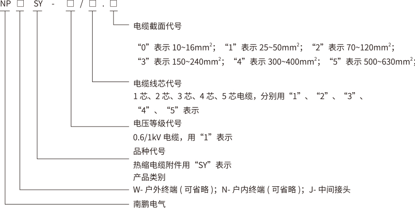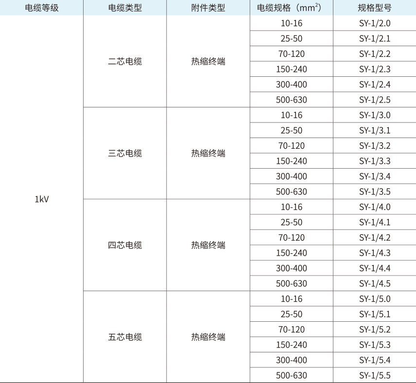 例:1.“SY-1/4.1”表示热缩四芯终端,额定电压为1kV适用于电缆截面为25-50mm2的四芯电缆。