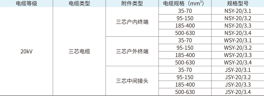 2.“JSY-20/3.2”表示热缩三芯中间接头,额定电压为20kV适用于电缆截面为95-150mm2的三芯电缆。