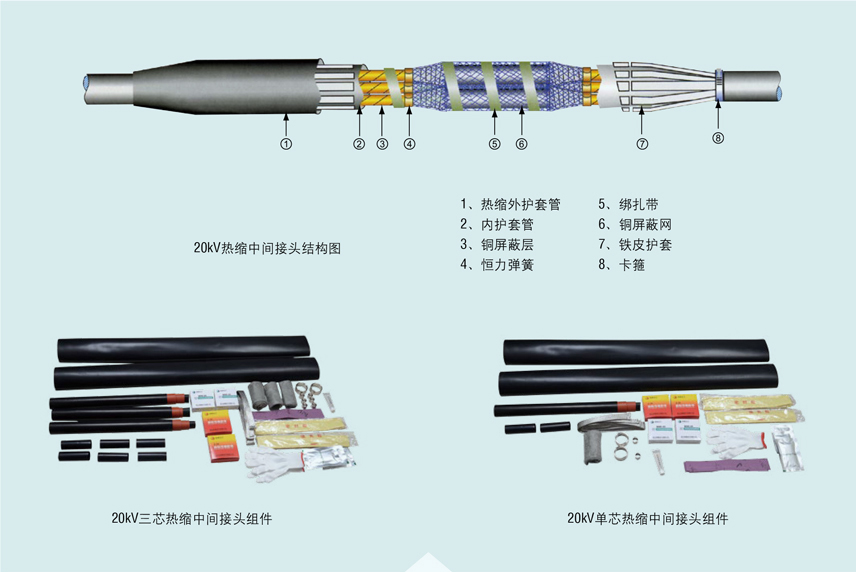 20kV热缩电缆附件系列产品,适用于12/20kV、18/24kV单芯、三芯聚乙烯和交联聚乙烯电力电缆、集防水、应力控制、屏蔽、绝缘于一体。具有良好的电力性能和机械性能,能在各种恶劣的环境条件下长期使用。具有重量轻、安装方便等优点。广泛地应用于电力、石油、化工、冶金、铁路、港口和建筑等各个领域。