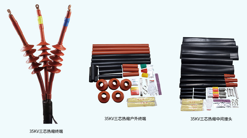 35kV三芯热缩电缆附件系列产品,适用于21/35、26/35kV三芯聚乙烯和交联聚乙烯电力电缆、集防水、应力控制、屏蔽、绝缘于一体。具有良好的电力性能和机械性能,能在各种恶劣的环境条件下长期使用。具有重量轻、安装方便等优点。广泛地应用于电力、石油、化工、冶金、铁路、港口和建筑等各个领域。