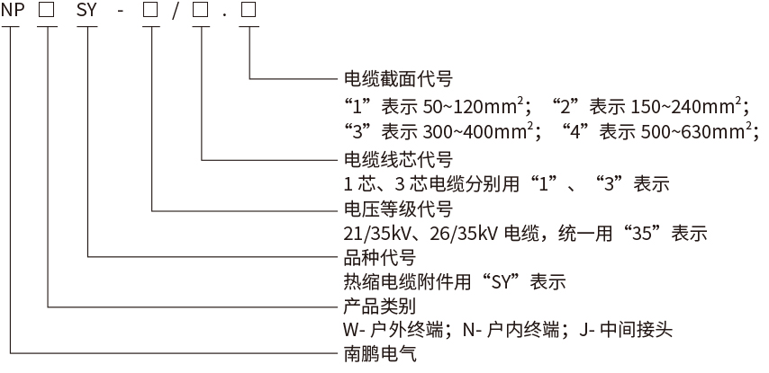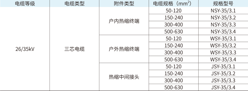 2.“JSY-35/3.2”表示热缩三芯中间接头,额定电压为35kV适用于电缆截面为150-240mm2的三芯电缆