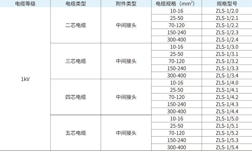 1.“ZLS-1/4.1”表示四芯冷缩中间接头,额定电压为1kV适用于电缆截面为25-50mm2的四芯电缆。